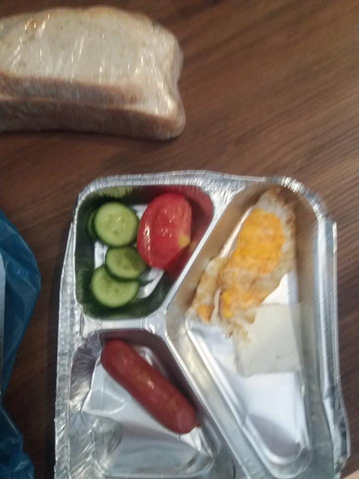 Mëngjesi përfshin një salçiçe, një vezë, dy feta buka, pak domate dhe kastravec. Gazetari shprehet se të paktën në menu duhet të shtohet edhe një vezë tjetër dhe bukë.