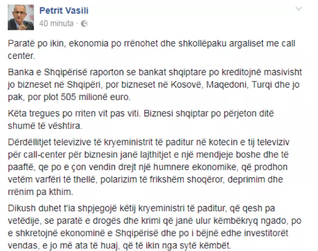 “Paratë po ikin, ekonomia po rrënohet dhe shkollëpaku argaliset me call center”, shkruan Vasili në një status në Facebook.