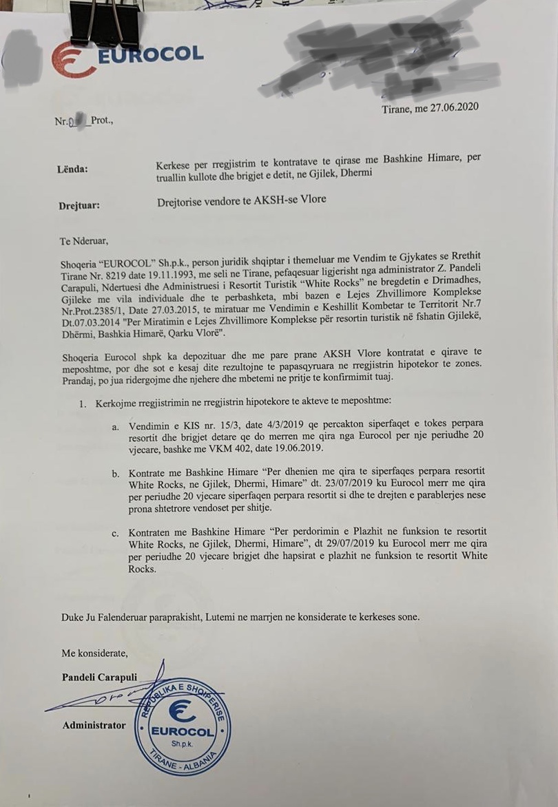 Në datë 27 qershor të këtij viti, Carapuli dorëzon në Agjencinë Shtetërore të Kadastrës, Dega Vlorë, regjistrimin e një kontrate qeraje që kishte lidhur me Bashkinë e Himarës. Kontrata shkruante se Eurocol si investitor strategjikë, kishte marrë me qira për 20 vite tokën e qytetarit Andon Bifsha.