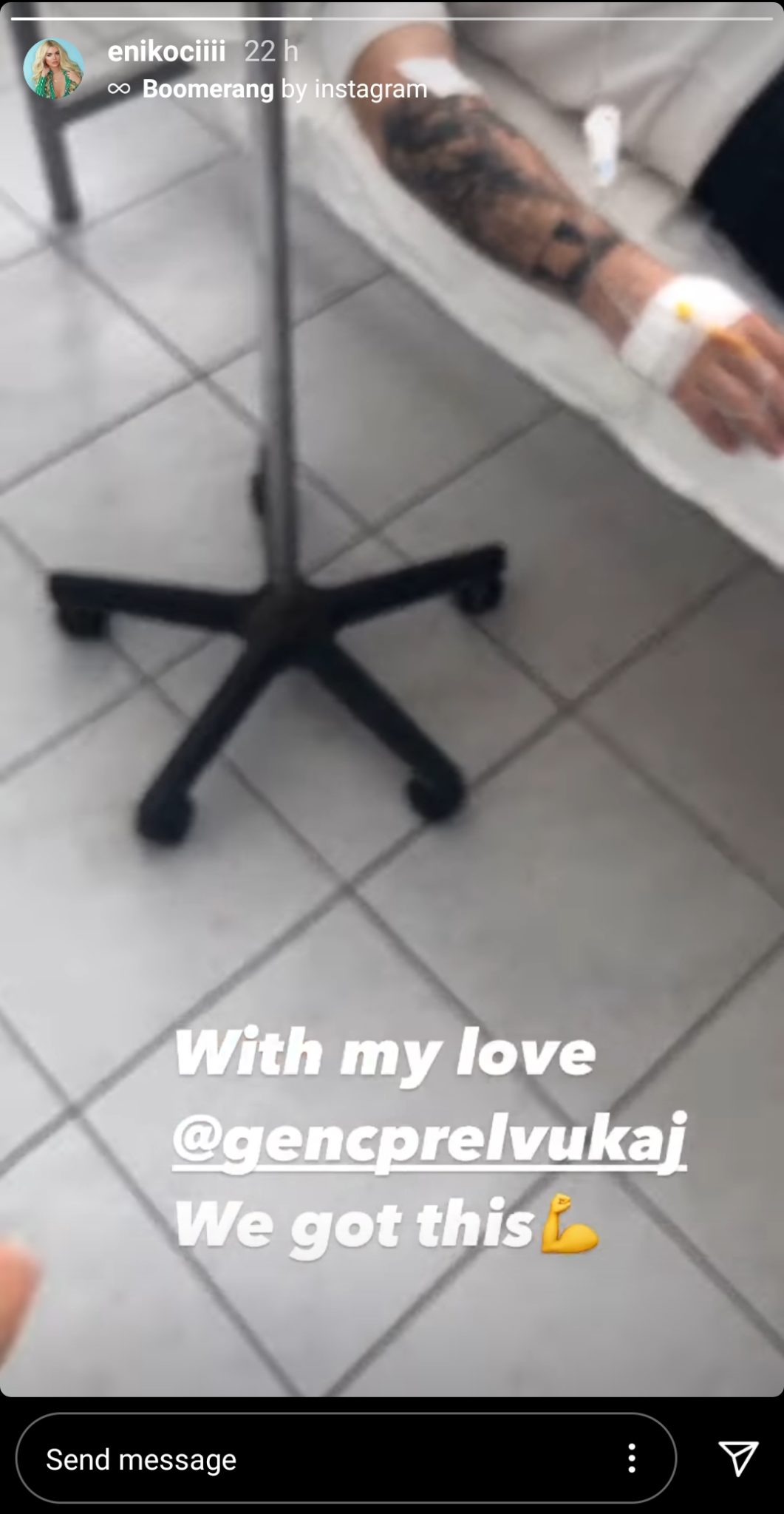 Nga ana tjetër, partnerja e tij Eni Koçi vendosi që në “Instastory” të postonte një video të Prelvukajt, i cili ndodhej në spital dhe po merrte serum.