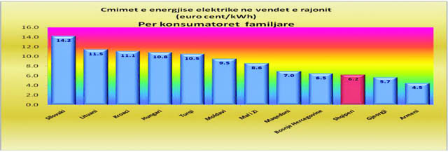 Shqiptarët me pagën minimale më të vogël në Europë paguajnë tarifën e energjisë thuajse në një nivel me vendet e tjera të rajonit. Në bazë të të dhënave të Shoqatës Rajonale të Rregullatorëve të Energjisë (ERRA) për tarifat e energjisë, mesatarja e çmimit të energjisë për konsum familjar është 8.8 eurocent për kW/h, ndërsa për konsumatorët jofamiljarë, kjo tarifë është mesatarisht 9.1 euro cent për kW/h. ERRA është burimi kryesor i të dhënave zyrtare të energjisë elektrike në vendet e Europës Qendrore dhe Lindore. Ajo përmban të dhënat tremujore nga viti 2000 deri më sot dhe mbulon 28 vende si: Shqipëria, Bullgaria, Kroacia, Estonia, Gjeorgjia, Hungaria, Moldavia, Polonia, Rumania, Rusia, Turqia, Ukraina etj. Në grafik janë paraqitur tarifat e energjisë elektrike para taksimit (TVSH-së) për konsumatorët familjarë, për të gjitha vendet e ERRA-s, në euro cent/kWh. Ky krahasim ka vlerë për bllokun e parë të konsumit, deri në 300 kW/h, pasi në Shqipëri, mbi këtë fashë, aplikohet çmim më i lartë. Nëse do t’u referohemi tarifave aktuale të ERE-s, çmimi mesatar i energjisë elektrike është 9.53 lekë/kWh.. Për konsumatorët familjarë, për bllokun e parë deri në 300 kWh, çmimi është 7.7 lekë/kWh. Për sa i përket bllokut të dytë mbi 300 kWh/orë, çmimi rritet në 13.5 lekë/kWh. Për klientët në tensionin e ulët, tarifat variojnë nga 7.6 në 16.1 lekë/kWh. Ndërsa, për klientët të furnizuar në 35 kW, çmimet variojnë nga 8.5 në 9.75 lekë/kWh.
