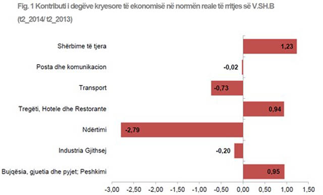 Ekonomia bën hap prapa në tremujorin e dytë të vitit 2014 me një rënie prej 0.61%. Kjo u pohua dje, zyrtarisht nga INSTAT. Kjo goditje e zbret rritjen ekonomike për 6-mujorin e parë në 0.45%, shumë larg shifrës 2.1%, që është premtuar për këtë vit. Sipas treguesit të Vlerës së Shtuar Bruto, ekonomia në tremujorin e dytë të vitit 2014 vlerësohet më poshtë kundrejt tremujorit të dytë të vitit 2013. Kontributin kryesor në rënien e treguesit të Vlerës së Shtuar Bruto e kanë dhënë degët e ekonomisë si ndërtimi me -2,79 pikë për qind, transporti me -0,73 pikë për qind dhe industria me -0,20 pikë për qind. Në degën e industrisë, rënia vërehet në nëndegën “Prodhimi dhe shpërndarja e energjisë elektrike dhe gazit” me -0,96 pikë për qind. Ndërsa, dega e shërbimeve ka kontribuar pozitivisht me +1,23 pikë për qind dhe “Bujqësia, gjuetia dhe pyjet e peshkimi” me +0,95 pikë për qind. Në degën “Tregti, hotele dhe restorante, kontributi është pozitiv +0,94 pikë për qind. Degët kryesore të ekonomisë për tremujorin e dytë të vitit 2014 krahasuar me tremujorin e dytë të vitit 2013 shfaqen si më poshtë: Aktiviteti bujqësor pati rritje prej 3,18%. Grupi i Industrive pati rënie prej 1,29%, edhe pse brenda këtij grupi, industria nxjerrëse dha ndikim pozitiv me një rrite 7,56%. Ecuria e grupit u ndikua nga performanca negative e industrisë përpunuese me 6,62%, e udhëhequr nga nëndega e energjisë elektrike, e cila pati një rënie me 29,20%. Aktiviteti i ndërtimit në tremujorin e dytë të vitit 2014 pati rënie prej 22,39% krahasuar me tremujorin e dytë të vitit 2013. Grupi i degëve “Tregti, hotele dhe restorante” pati një rritje prej 7,09%. Në këtë grup, tregtia pati një rritje prej 8,12%, ndërsa hotelet dhe restorantet patën rritje me vetëm 0,69%. Ndërkaq, aktiviteti i transportit, vijon të shënojë rënie, ai zbriti me 23,05% në tremujorin e dytë të vitit 2014 krahasuar me të njëjtin tremujor të një viti më parë. Kjo rënie është e ndikuar nga performanca e keqe e transportit ajror. Grupi “Posta dhe Komunikacioni” u shfaq me një rënie prej 1,02% në tremujorin e dytë të vitit 2014 përkundrejt tremujorit të dytë të vitit 2013. Ndërsa grupimi i shërbimeve në këtë periudhë pati rritje me 4,55%. Në këtë grup, ndikim pozitiv dhanë pothuajse të gjithë sektorët si: administrata publike, arsimi, shëndetësia, sektori financiar dhe aktivitetet e tjera të shërbimit kolektiv, social, kulturor etj. Ndërsa me rënie u shfaq sektori i pasurive të patundshme, rentës dhe aktiviteteve ndihmëse të biznesit (aktivitete ligjore, të arkitekturës, inxhinierike, si dhe konsulenca financiare, komerciale etj). Sa u përket ndryshimeve në krahasim me tremujorin e parë të këtij viti, treguesi i Vlerës së Shtuar Bruto vlerësohet me një rritje minimale 0,38%.