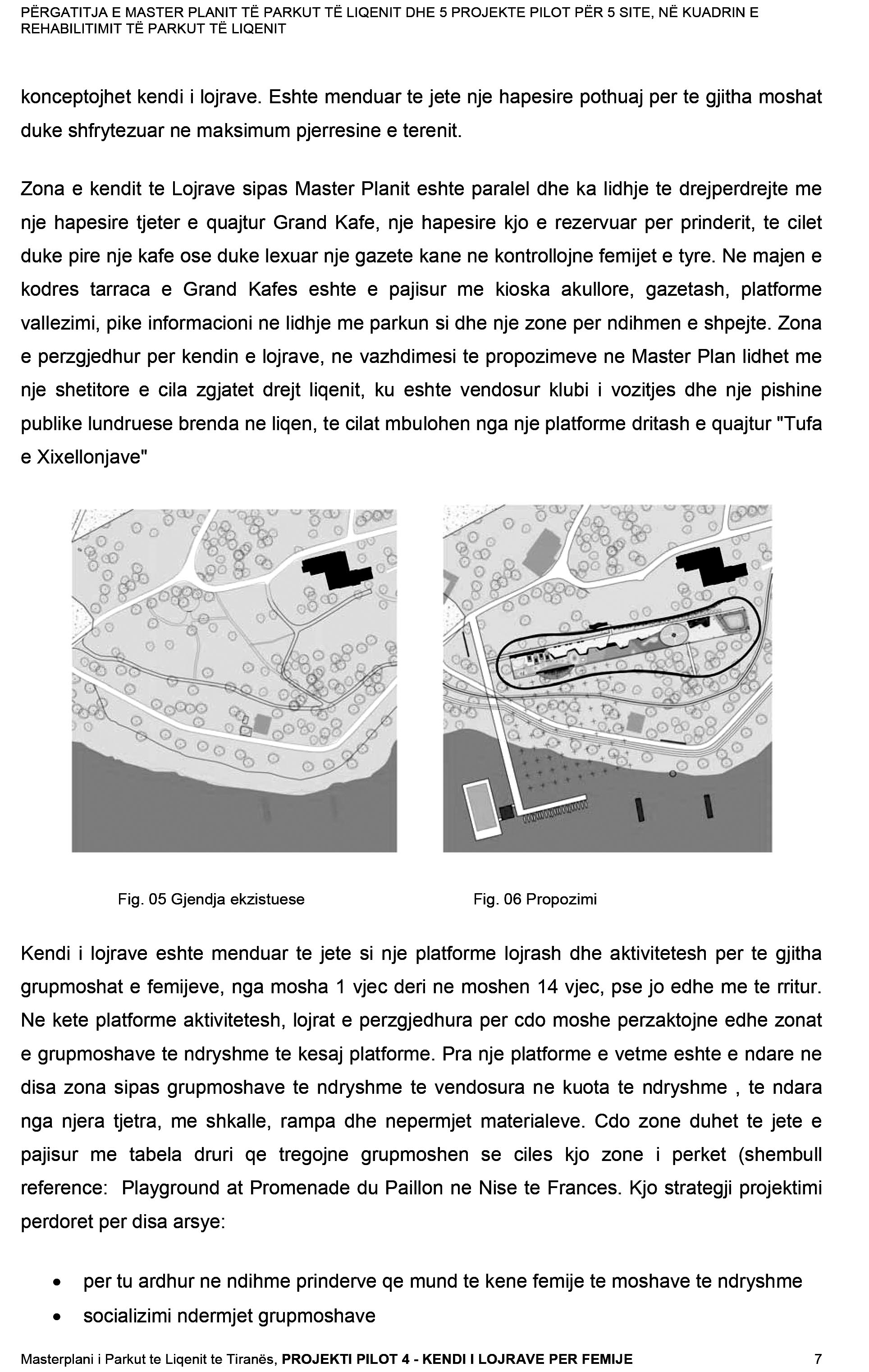 Gazeta ka bërë një hulumtim të dokumenteve të paraqitura për ngritjen e këtij këndi lojërash, i cili është kontestuar së fundmi nga shoqëria civile dhe opozita. Madje janë bërë edhe protesta dhe ka pasur përplasje mes protestuesve dhe policisë. Gazeta “Shqip” ka siguruar një dokument që mban datën 25 shtator 2015. Shoqëria private “Bolles + Wilson”, ka bërë edhe një relacion arkitektonik, i cili u është bashkëlidhur dokumenteve të lidhjes së kontratës me firmat që po e ndërtojnë këndin apo të dhënave të tjera. Me interes është ngritja e këndit të lojërave për fëmijë. “Është menduar të jetë një hapësirë pothuajse për të gjitha moshat duke shfrytëzuar në maksimum pjerrësinë e terrenit”, shkruhet në relacion, që më pas jep detaje të tjera. “Zona e këndit të lojërave, sipas masterplanit, është paralel dhe ka lidhje të drejtpërdrejtë me një hapësirë tjetër të quajtur ‘Grand Kafe’, një hapësirë kjo e rezervuar për prindërit, të cilët duke pirë një kafe ose duke lexuar një gazetë kanë në kontroll fëmijët e tyre”, vijon dokumenti. Sipas saj, në majën e kodrës, tarraca e “Grand Kafe” është e pajisur me kioskë akulloreje, gazete, platformë vallëzimi, pikë informacioni në lidhje me parkun, si dhe një zonë për ndihmën e shpejtë. Zona e përzgjedhur për këndin e lojërave, në vazhdimësi të propozimeve në master plan lidhet me një shëtitore, e cila zgjatet drejt liqenit, ku është vendosur klubi i vozitjes dhe një pishinë publike lundruese brenda në liqen, të cilat mbulohen nga një platformë dritash e quajtur “Tufa e xixëllonjave”.