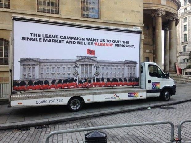 Mbështetësit e qëndrimit të Britanisë në BE shkruajnë: “Ata që mbështesin fushatën e daljes nga tregu i përbashkët duan që të jemi si Shqipëria. Seriozisht”. Emri i Shqipërisë është bërë kështu objekt ironie nga britanikët, të cilët e kanë gjetur të pavend deklaratën e sekretarit të Drejtësisë, Michael Gove. “Daily Mail” e quajti qesharake idenë e tij dhe dërgoi një gazetar në Shqipëri për t’u treguar britanikëve se si gjysma e shqiptarëve jetojnë në varfëri, nën nivelin botëror të saj, me më pak se pesë dollarë në ditë. Gazetari i “Daily Mail” ka vizituar disa vende periferike të kryeqytetit, ku veç problemeve ekonomike, analizon edhe disa prej sfidave të qeverisë së sotme. Lufta ndaj kultivimit të kanabisit, problemet me papunësinë dhe shumë probleme të tjera sociale janë evidentuar në shkrimin e “Daily Mail”, si një përgjigje ndaj sekretarit të Drejtësisë.