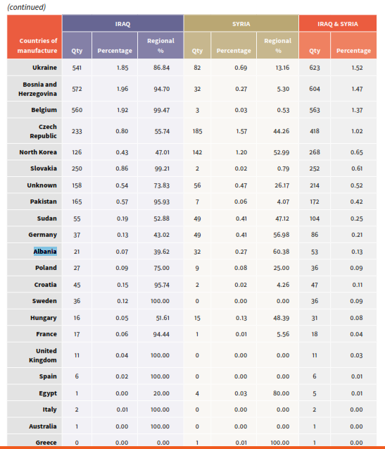 Në tabelat “Sasitë e armëve të dokumentuara në Irak dhe Siri, sipas shtetit të prodhimit”, Shqipëria rezulton me 53 armë të identifikuara, ose 0.13% të totalit, nga të cilat 21 në Irak dhe 32 në Siri.