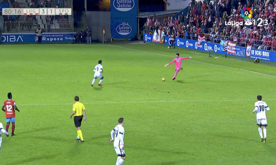 Juan Carlos pa që homologu i tij kishte dalë nga porta dhe nuk ngurroi të lëshonte një “bombë” nga mesfusha, për të shënuar golin e tretë ndaj Sporting Gijon.