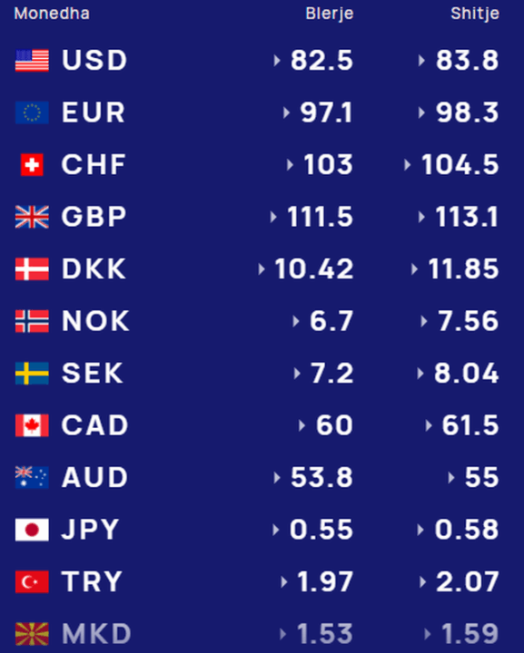 Euro do të më blihet 97.1 lekë dhe do të më shitet 98.3 lekë. Franga zvicerane do të më blihet 103 lekë dhe do të jetë më 104.5 lekë.