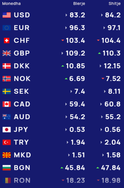 Për kursin e monedhave të tjera shihni tabelën e mëposhtme: