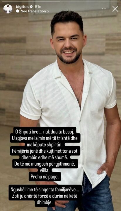 “O Shpati bre… nuk dua ta besoj. U zgjova me lajmin më të trishtë dhe ma këpute shpirtin. Fëmijëria jonë dhe kujtimet tona sot dhembin edhe më shumë. Do më mungosh përgjithmonë vëlla. Prehu në paqe. ngushëllime të sinqerta familjarëve… Zoti ju dhëntë forcë e durim në këtë dhimbje”.