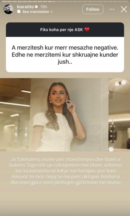 “Ju falenderoj shumë për mbështetjen dhe fjalët e bukura. Sigurisht që ndonjëherë mërzitem, sidomos kur ka komente në lidhje me familjen, por kam mësuar të mos i lejoj të më përcaktojnë. Dashuria dhe energjia e mirë peshojnë gjithmonë më shumë”, është përgjigjur Kiara Tito.