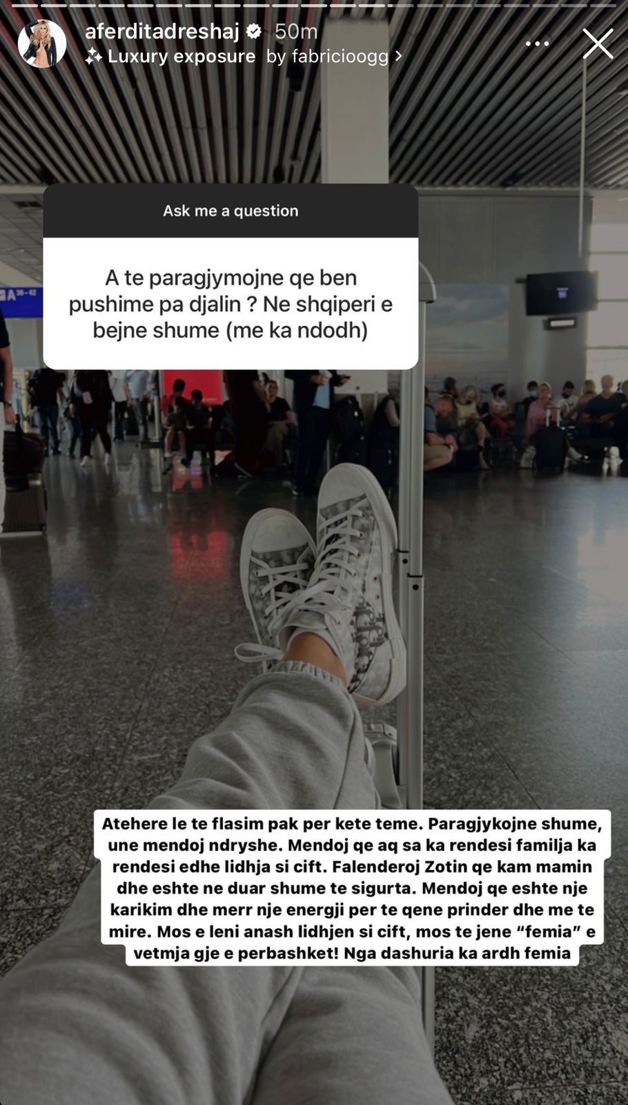 Mirëpo, padyshim te ndjekësit lind pyetja se si mund të niset Afërdita në një udhëtim pa djalin e saj duke nisur kështu paragjykimet. E në një ‘Ask’ të bërë pak më parë, modelen e kanë pyetur nëse është ndjerë e paragjykuar lidhur me këtë fakt.