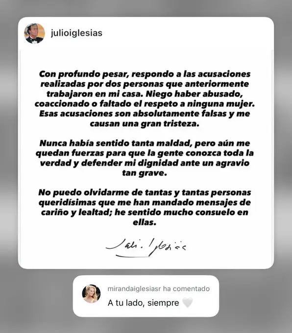 Julio Iglesias ka publikuar së fundmi një deklaratë për të mbrojtur veten nga akuzat për trafikim të dyshuar dhe sulm seksual të dy prej ish-punonjësve të tij shtëpiakë.