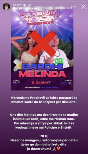 Këtë herë bëhet fjalë për Bardhin dhe Melindën, të cilët kanë anuluar koncertin ku do të performonin së bashku në Preshevë. Lajmërimin e kanë bërë nëpërmjet një postimi në rrjete sociale, ku Bardhi është shprehur se ka disa keqkuptime me Policinë e Shtetit.