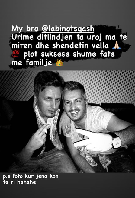 Me këtë pozë, këngëtari i uron ditëlindjen mikut të tij, Labinot Gashi. “Vëllai im. Urime ditëlindjen. Të uroj më të mirën dhe shëndetin vëlla. Plot suksese, shumë fat bashkë me familjen. Foto kur kemi qenë të rinj,”- ka shkruar këngëtari krahas fotos bardh e zi.