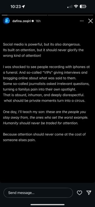 “Është absurde, çnjerëzore dhe thellësisht mosrespektuese që një moment i tillë privat të kthehet në një cirk”, shkroi Dafina Zeqiri.