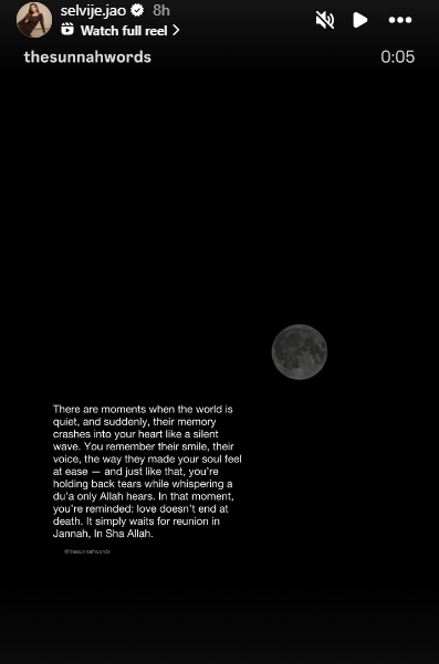 “Ka momente kur bota është e qetë, dhe papritur kujtimi i tyre të godet në zemër si një valë e heshtur. Ti kujton buzëqeshjen e tyre, zërin e tyre, mënyrën si të qetësonin shpirtin – dhe ashtu, në çast, po përpiqesh t’i mbash lotët, ndërsa pëshpërit një lutje që vetëm Allahu e dëgjon. Në atë moment, të kujtohet: dashuria nuk përfundon me vdekjen. Ajo thjesht pret për ribashkim në xhenet, inshaAllah”, ka shkruar Selvije në postimin në “Instastory”.