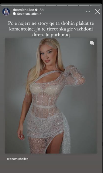 Kujtojmë që Dea Mishel nuk është treguar gjithashtu aspak tolerante në lidhje me shkrimet që janë bërë për të në portale, duke shpërthyer ndaj tyre me një postim, duke iu thënë më puthni të pasmet.