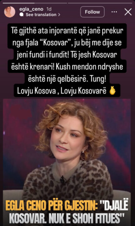 Egla Ceno, fituesja e edicionit të tretë të Big Brother VIP Albania, ka reaguar ndaj kritikave që mori në rrjetet sociale pas një deklarate të saj, ku e cilësonte Gjestin si “djalosh kosovar”.