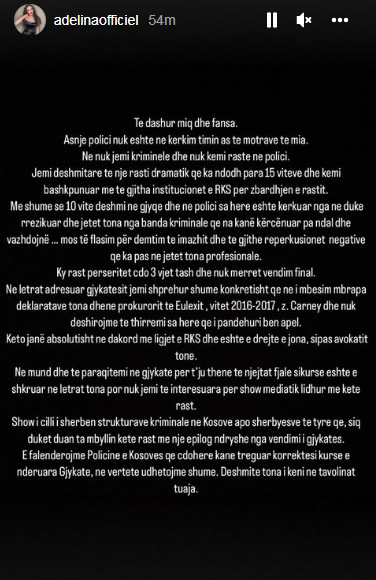 “Të dashur miq dhe fansa. Asnjë polici nuk është në kërkim timin as të motrave të mia. Ne nuk jemi kriminele dhe nuk kemi raste në polici. Jemi dëshmitare të një rasti dramatik që ka ndodhur para 15 vitesh dhe kemi bashkëpunuar me të gjithë institucionet e Republikës së Kosovës për zbardhjen e rastit. Më shumë se 10 vite dëshmi në gjyqe sa herë është kërkuar nga ne duke rrezikuar jetët tona nga banda kriminale që na kanë kërcënuar pa ndalur dhe vazhdojnë. Mos të flasim për dëmtim të imazhit dhe të gjithë reperkusionet negative që ka pasur në jetët tona profesionale.Ky rast përsëritet çdo 3 vjet tani dhe nuk meret një vendim final.