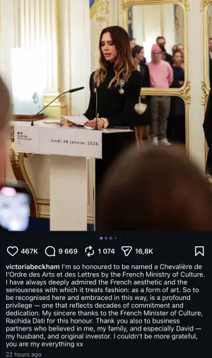 Postimi u publikua në kuadër të një momenti të rëndësishëm për Victorinë, pasi ajo u nderua me çmimin francez “Chevalier de L’Ordre des Arts et des Lettres” nga Ministrja e Kulturës, Rachida Dati. Krahas fotove nga ceremonia, ajo ndau një shënim falënderimi të gjatë, por ajo që mori më shumë vëmendje ishte një fjali e shkurtër: “Familja është gjithçka”.