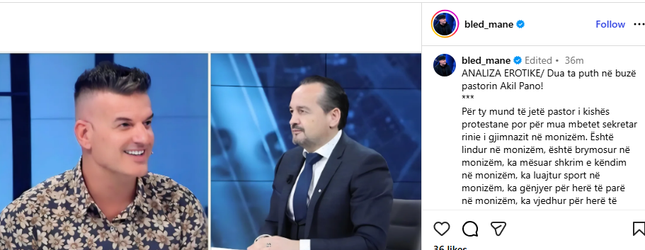 Këtij reagimi nuk i ka munguar një kundërpërgjigje nga Bledi Mane, i cili ka habitur që në fillim: “ANALIZA EROTIKE/ Dua ta puth në buzë pastorin Akil Pano!”.