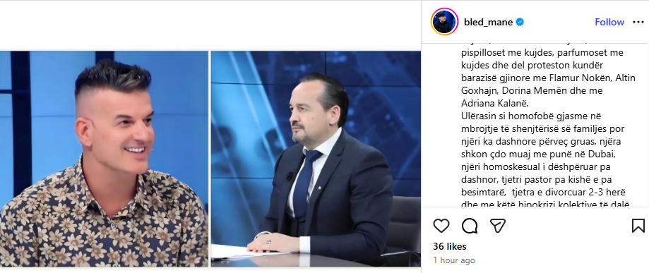 “Më vjen keq për pastorin Akil Pano, ka marrë flamurin e homofobizmit dhe është diçka që në mos një ditë, një ditë tjetër do ketë një lloj kostoje. Po t’i vësh re thellë-thellë, këta që ulërasin paradite, këta bëjnë namin e zi nga darka. I ke homoseksualët më të zjarrtë”.