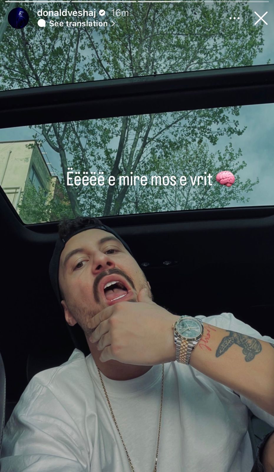 Tanimë jemi mësuar me postimet e tij që ‘fshehin’ diçka prapa tyre dhe një Instastory i publikuar para disa ditësh na tërhoqi vëmendjen. Teksa aktori postoi një ‘selfie’, krahas e shoqëroi me një mbishkrim shumë të çuditshëm: “Ëëëë mirë mos e vrit mendjen”. Syri ynë kritik dyshoi se mund të kishte lidhje me dikë dhe si gjithmonë nuk ka gabuar.