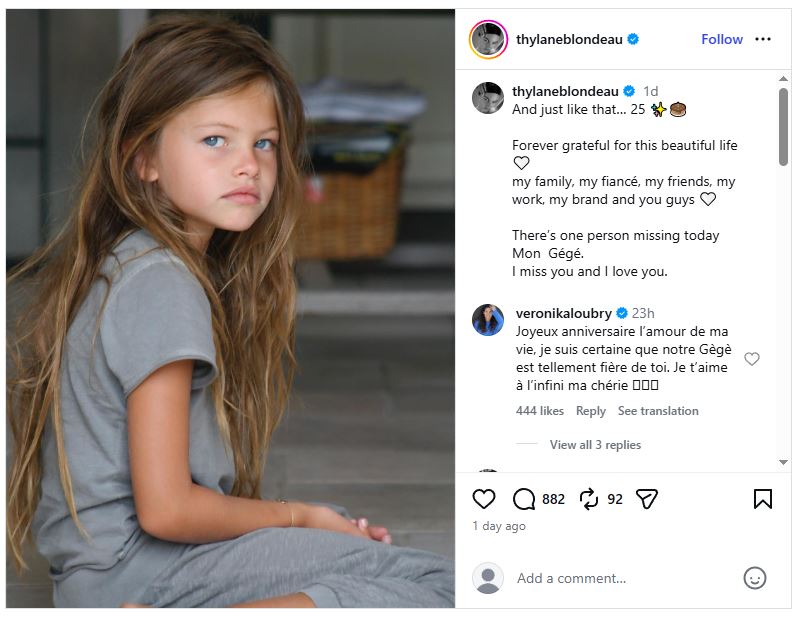 Blondeau ndau një foto nga fëmijëria e saj, me mbishkrimin: “Dhe papritmas 25. Do të jem gjithmonë mirënjohëse për këtë jetë të bukur, për familjen time, të fejuarin tim, miqtë e mi, punën time, kompaninë time dhe ju. Sot mungon një person. Mon Gege. Më mungon dhe të dua.”