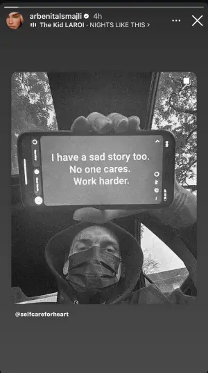 Ky postim vjen në një periudhë të tensionuar për Arbenitën, e cila po përballet ligjërisht me ish-partnerin e saj, reperin Fero. Në foton e ndarë, shihet një person duke mbajtur një telefon, me mbishkrimin: “Edhe unë kam një histori të trishtë. Askujt s’i intereson. Puno më fort”.