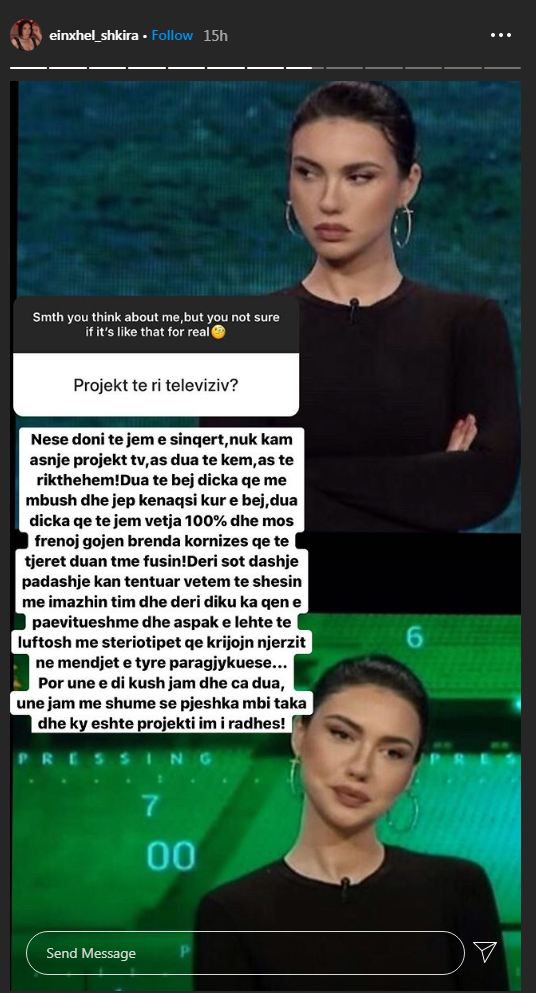 “Unë e di kush jam dhe çfarë dua, unë jam më shumë se pjeshka mbi taka dhe ky është projekti im i radhës”. Kështu i është përgjigjur Enxhel Shkira një ndjekëse e cila e ka pyetur për ndonjë projekt të ri televiziv.