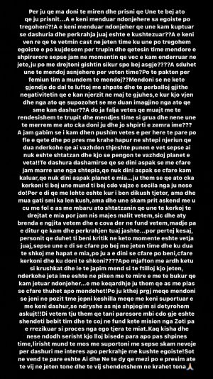 Për ju që ma doni të mirën dhe prisni që unë të bëj ato që ju prisnit… A e keni menduar ndonjëherë sa egoiste po tregoheni?! A e keni menduar ndonjëherë që unë kam kuptuar se dashuria dhe përkrahja juaj është e kushtëzuar?? A e keni vënë re që të vetmin çast në jetën time ku unë po tregohem egoiste e po kujdesem për trupin dhe qetësinë time mendore e shpirtërore sepse jam në momentin që veç e kam ëndërruar në jetë, ju po më drejtoni gishtin sikur s’po bëj asgjë???? A s’duhet unë të mendoj asnjëherë për veten time? Po të paktën për femijën tim a mundem të mendoj?? Mendoni se në këtë gjendje do dal të luftoj me shpate dhe të përballoj gjithë negativitetin që e kanë njerzit në majë të gjuhës, e kur kjo vjen dhe nga ato që supozohet se më duan imagjino nga ato që s’më kanë dashur?? A do ia falja vetes që muajt më të rëndesishëm të trupit dhe mendjes time si grua dhe nënë unë të merrem me ato çfarë doni ju dhe jo shpirti e zemra ime??? A jam gabim se i kam dhënë pushim vetes e për herë të parë po fle e qetë dhe po pres me krahë hapur në shtëpi njeriun që dua ndërkohë që ai vazhdon thjesht punën e vet sepse ai nuk është shtatzënë dhe kjo se pengon të vazhdojë planet e veta!! Të dashura dashamirëse që s’e dini aspak se me çfarë jam marrë unë nga shtëpia, që nuk dini aspak se çfarë kam kaluar, që nuk dini aspak planet e mia… ju them se ato çfarë kërkoni t’i bëj unë mund t’i bëjë çdo vajzë e secila nga ju nëse do! Por e di që më lehtë është kur i bën dikush tjetër, ama dhe mua gati s’mi ka lënë kush, ama dhe unë s’kam pritur askënd me u çu me fol e as me mbaru atë shtatzëninë që unë të kërkoj të drejtat e mia por jam nisur majës malit vetëm, siç dhe aty brenda e ngjita vetëm dhe e çova deri në fund vetëm, madje pa e ditur që kam dhe përkrahjen tuaj jashtë… por përtej kësaj, personit që duhet t’i bëni kritikë në këto momente është vetja juaj, sepse unë e di se çfarë po bëj me jetën time dhe ku dua të shkoj me hapat e mia, po ju a e dini se çfarë po bëni, çfarë kërkoni dhe ku doni të shkoni???? Apo mjafton me ardh këtu si krushkat dhe le të japim mend si të ftillojë kjo jetën, ndërkohë jeta ime është në pikën më të mirë e më të bukur që kam jetuar ndonjëherë… e me keqardhje ju them që as më plas se çfarë thuhet apo mendohet! Po ju kthej përgjigje meqë mendoni se jeni në pozitë të më jepni këeshilla meqë më keni suportuar e më keni dashur, se ndryshe asnjë shpjegim s’i detyrohem askujt!! Di vetëm t’ju them që tani parësore mbi çdo gjë është shëndeti bebit tim dhe të çoj në fund këtë mision nga Zoti pa e rrezikuar si proces nga ego të tjera të miat. Kaq kisha dhe nëse ndodh sërisht kjo lloj bisede para apo pas shpinës time, lirisht mund të mos më suportoni më sepse s’kam nevojë për dashuri me interes apo përkrahje me kushte egoiste! Sot në vend të parë është Ai dhe Ne të dy që mezi po e presim atë të vijë në jetën tonë dhe të vijë shëndetshëm në krahet tona.