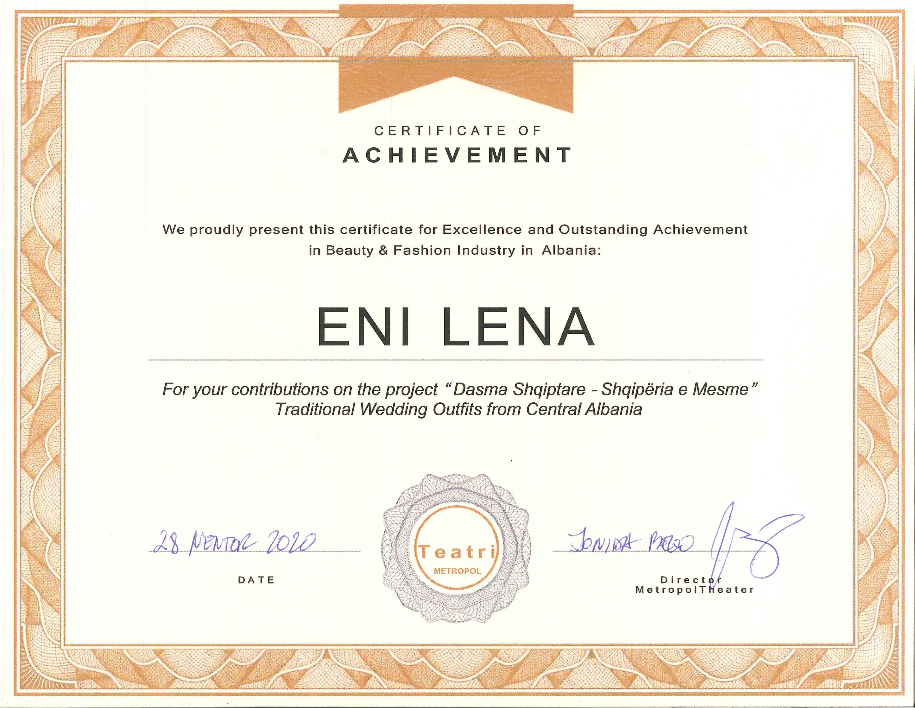 Më së fundmi ajo është nderuar dhe me çmimin “Ekselencë në Industrinë e Bukurisë dhe Modës në Shqipëri” nga Teatri Metropol, për kontributin e saj në projektin tepër të suksesshëm “Dasma Shqiptare – Shqipëria e Mesme”.