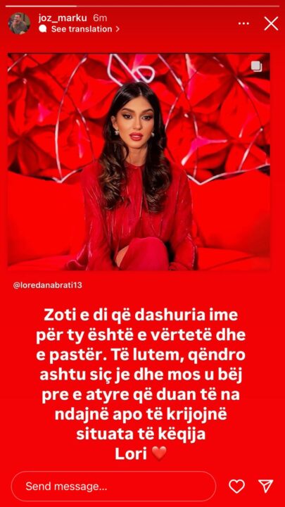 “Zoti e di që dashuria ime për ty është e vërtetë dhe e pastër. Të lutem, qëndro siç je dhe mos u bëj pre e atyre që duan të na ndajnë apo të krijojnë situata të këqija. Lori zemër”, ka shkruar Jozi në një postim në “Instastory”.
