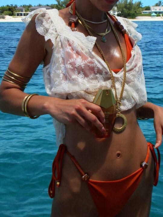 Në përshkrimin e postimit, modelja përdori nota humori teksa përmendi pushimet e saj, ndërkohë që promovoi edhe linjën e saj të re të parfumeve për trup dhe flokë.