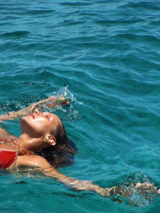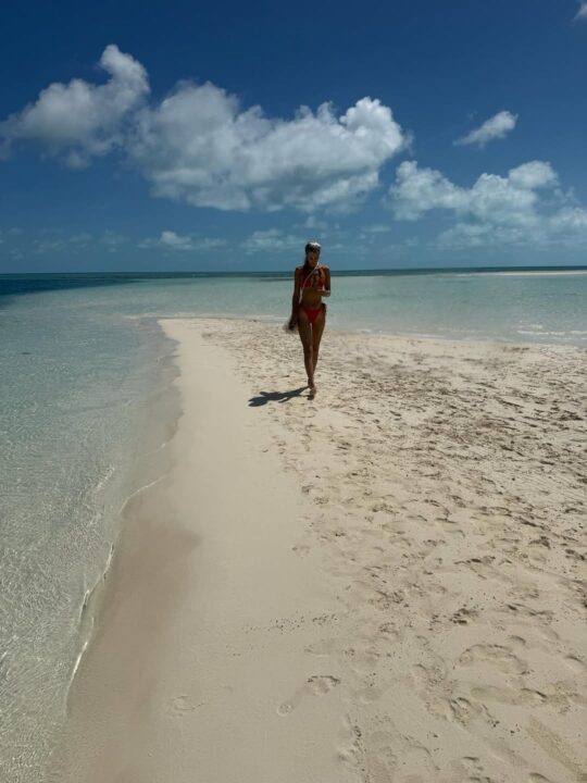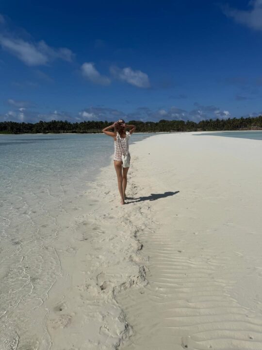 Në foto, Bella shihet duke pushuar në plazh, duke lundruar me varkë dhe duke notuar në ujërat e kristalta, duke reflektuar një atmosferë qetësie dhe pushimi.