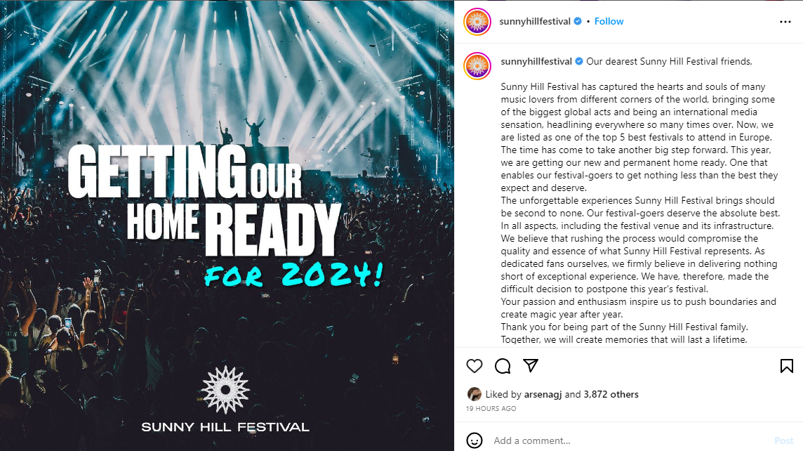 “Ne besojmë se nxitimi i procesit të punës do të zvogëlonte cilësinë dhe esencën e asaj që Sunny Hill Festival e përfaqëson. Duke qenë edhe vet fansa të muzikës dhe festivaleve, ne besojmë shumë në ofrimin e përvojës unike dhe të jashtëzakonshme që ne si festival duhet ta ofrojmë. Prandaj, kemi marrë vendimin e vështirë për ta shtyrë edicionin e sivjetmë të Sunny Hill Festival, që t’i japim kohë krijimit të hapësirës së re. Ruani datat për një edicion masiv të Sunny Hill Festival në fundjavën e parë të gushtit 2024.