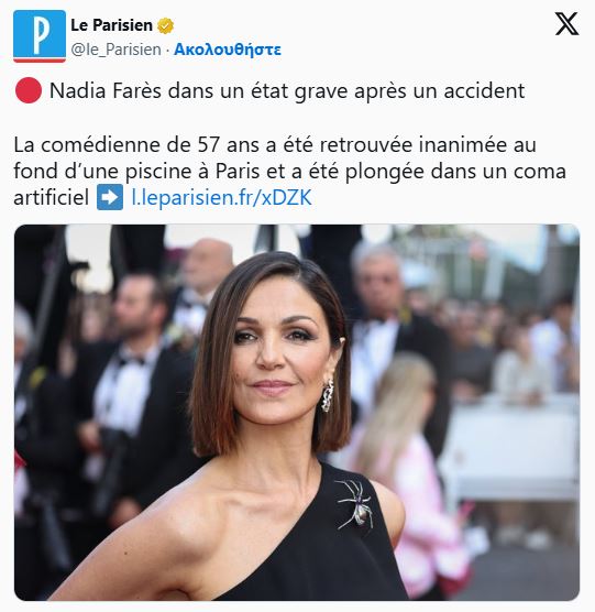 Aktorja e njohur franceze, Nadia Fares, është në koma të induktuar pas një incidenti në një pishinë, ku u gjet pa ndjenja në fund të objektit.