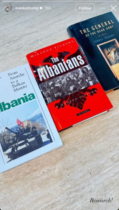 Në një fotografi të publikuar në “Instasotyr”, Ivanka ka postuar tre libra: “Albania: From Anarchy to Balkan Identity” nga Miranda Vickers dhe James Pettifer, “The Albanians: A modern history” po nga Miranda Vickers dhe “Gjenerali i ushtrisë së vdekur” nga Ismail Kadare.