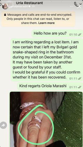 Sipas rrëfimit të ndarë në rrjetet sociale, Oriola e kishte hequr unazën për të larë duart dhe, siç ndodh ndonjëherë edhe me gjërat më luksoze, e kishte harruar aty. Vetëm pasi u largua nga restoranti, kuptoi se “diçka nuk shkonte” në gisht.
