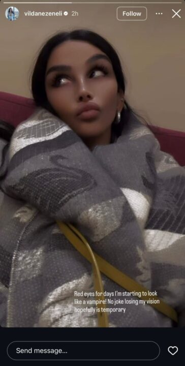 Modelja shqiptare Vildane Zeneli ka shqetësuar ndjekësit e saj pas një postimi të fundit në “Instagram Story”, ku ka ndarë një moment lidhur me gjendjen e saj shëndetësore. Bukuroshja shfaqet e mbështjellë me një batanije, ndërsa tregon se prej disa ditësh po vuan nga skuqje e fortë e syve: “Sytë e kuq prej ditësh, kam filluar të dukem si vampire!”