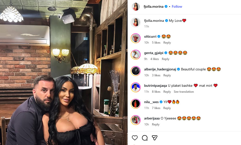 Fotografitë e postuara tregojnë momente të ngrohta dhe plot dashuri, ku çiftit duket qartë se nuk i mungon harmonia dhe afërsia. Si gjithmonë, Fjolla ka arritur të tërheqë vëmendjen e ndjekësve të saj me një postim të thjeshtë, por plot kuptim. Reagimet kanë qenë të shumta, me shumë fansa që e vlerësuan bukurinë e marrëdhënies dhe e shprehën gëzimin për të.