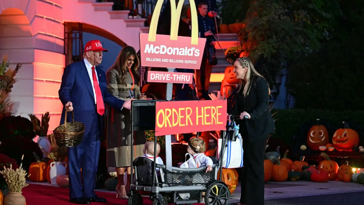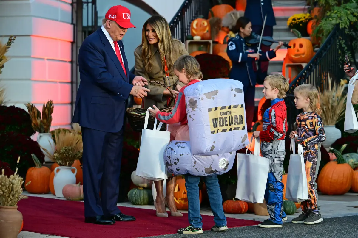 Çifti shpërndau çokollata Hershey dhe Twizzlers, të paketuara në kuti me vulën presidenciale, për një radhë fëmijësh dhe prindërish që shtrihej përgjatë rrugicës. Mure të përkohshme pengonin pamjen e punimeve për ndërtimin e sallës së re të ballove të Trump në Shtëpinë e Bardhë, që kishte çuar në shembjen e Krahut Lindor, megjithatë një buldozer i parkuar shihej ende në anën tjetër.
