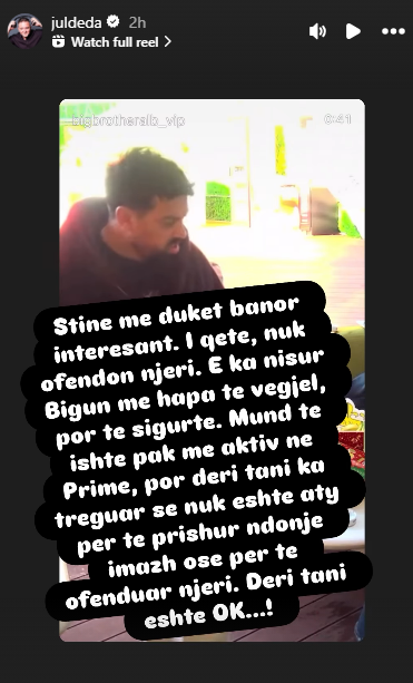 “Stine më duket banor interesant. I qetë, nuk ofendon njeri. E ka nisur Big-un me hapa të vegjël, por të sigurt. Mund të ishte pak më aktiv në Prime, por deri tani ka treguar se nuk është aty për të prishur ndonjë imazh ose për të ofenduar njeri. Deri tani është OK…!”, shkruan bashkëngjitur me videon Julian Deda.