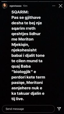 “Para së gjithave, desha të bëj një sqarim rreth çështjes lidhur me Meriton Mjekiqin, njëkohësisht babai i djalit tonë, të cilin mund ta quaj baba ‘biologjik’. E përdor këtë term, pasi që Meritoni asnjëherë nuk e ka takuar djalin e tij live. Ndërkaq që Loarin, djalin tonë, e përdor vetëm nëpër rrjetet sociale sa për t’i ngritur imazhin vetes së tij.