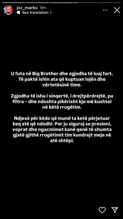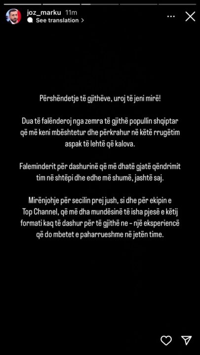 “Përshëndetje të gjithëve, uroj te jeni mirë! Dua të falënderoj nga zemra të gjithë popullin shqiptar që më keni mbështetur dhe përkrahur në këtë rrugëtim aspak të lehtë që kalova.