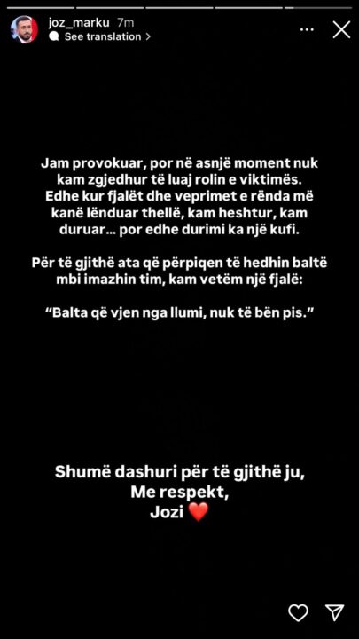 Edhe kur fjalët dhe veprimet e rënda më kanë lënduar thellë, kam heshtur, kam duruar… por edhe durimi ka një kufi. Për të gjithë ata që përpiqen të hedhin baltë mbi imazhin tim, kam vetëm një fjalë: “Balta që vjen nga llumi, nuk të bën pis”, ka shkruar Jozi në postimet e tij në “Instastory”.