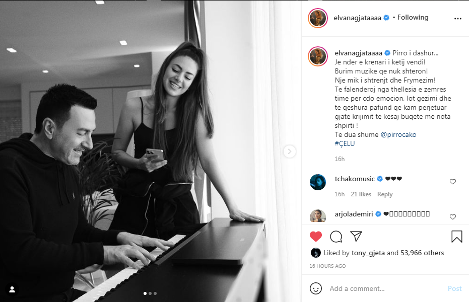 Për këtë arsye, Elvana i ka dedikuar Pirros dhe Darkos disa fjalë zemre në rrjete sociale. Ajo ka ndarë në “Instagram” disa foto të shkëputura gjatë punimit të këngëve me Pirro Çakon.