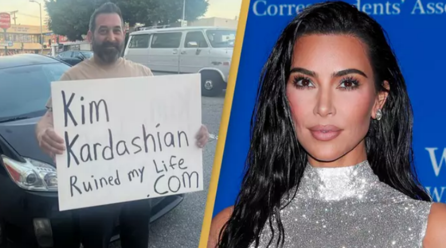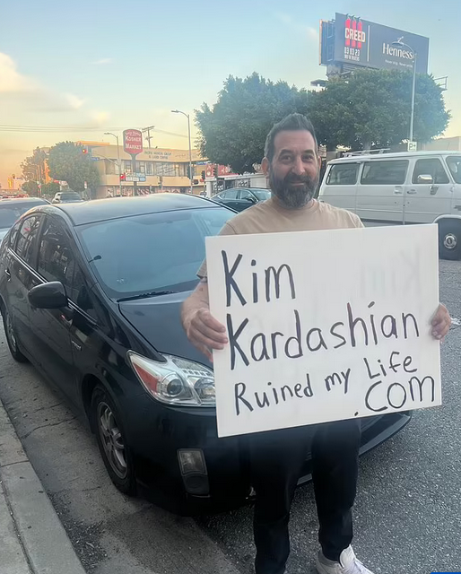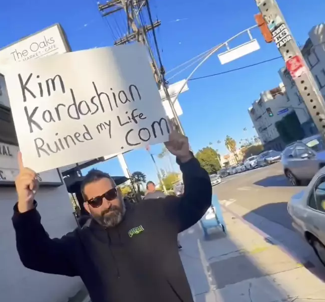 Në shumë nga videot e tij në Instagram e TikTok, burri shihet duke ecur në trotuar me pankartën ku shkruhet: “Kim Kardashian më shkatërroi jetën.com.”