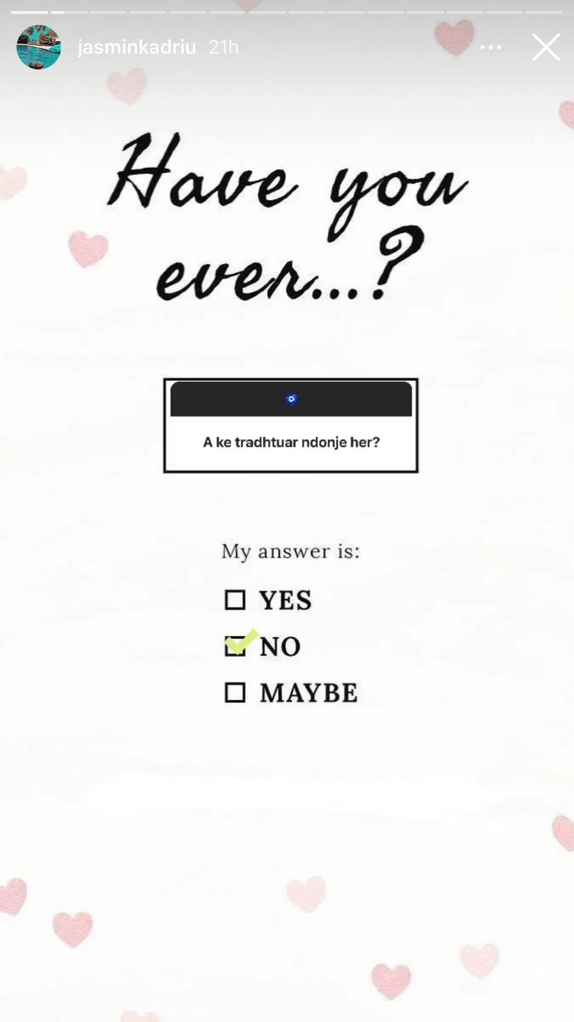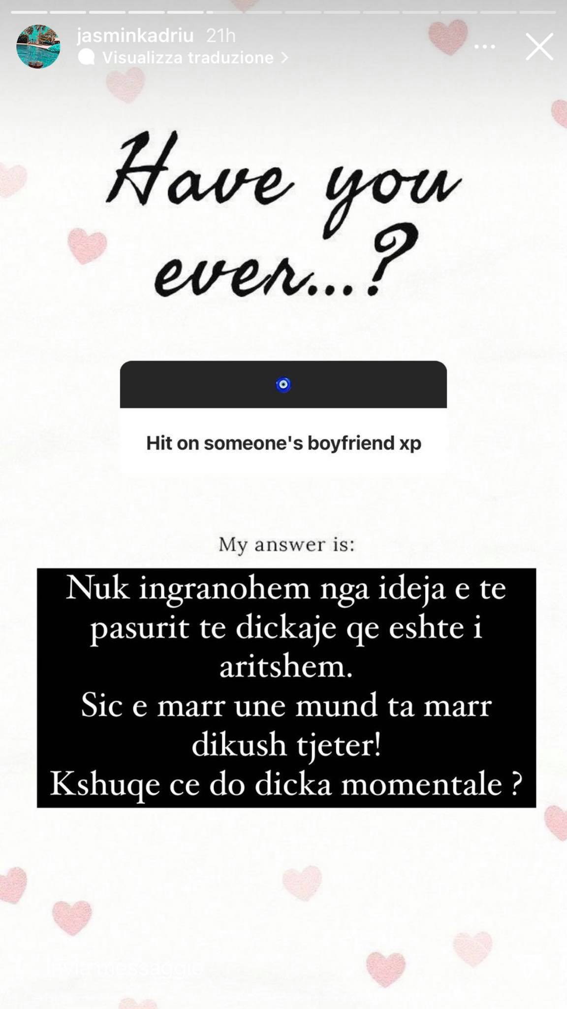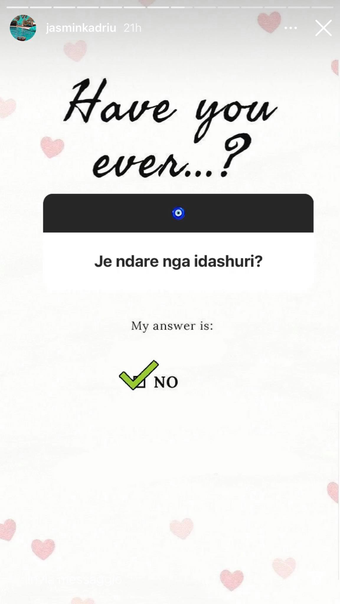 Mbrëmjen e djeshme, Jasmina Kadriu vendosi që të bënte një lojë me ndjekësit e saj në “Instagram”. “A keni ndonjëherë…?”, ishte kutia që ajo la në “Instastory” dhe më pas fansat do të bënin pyetjet e tyre.
