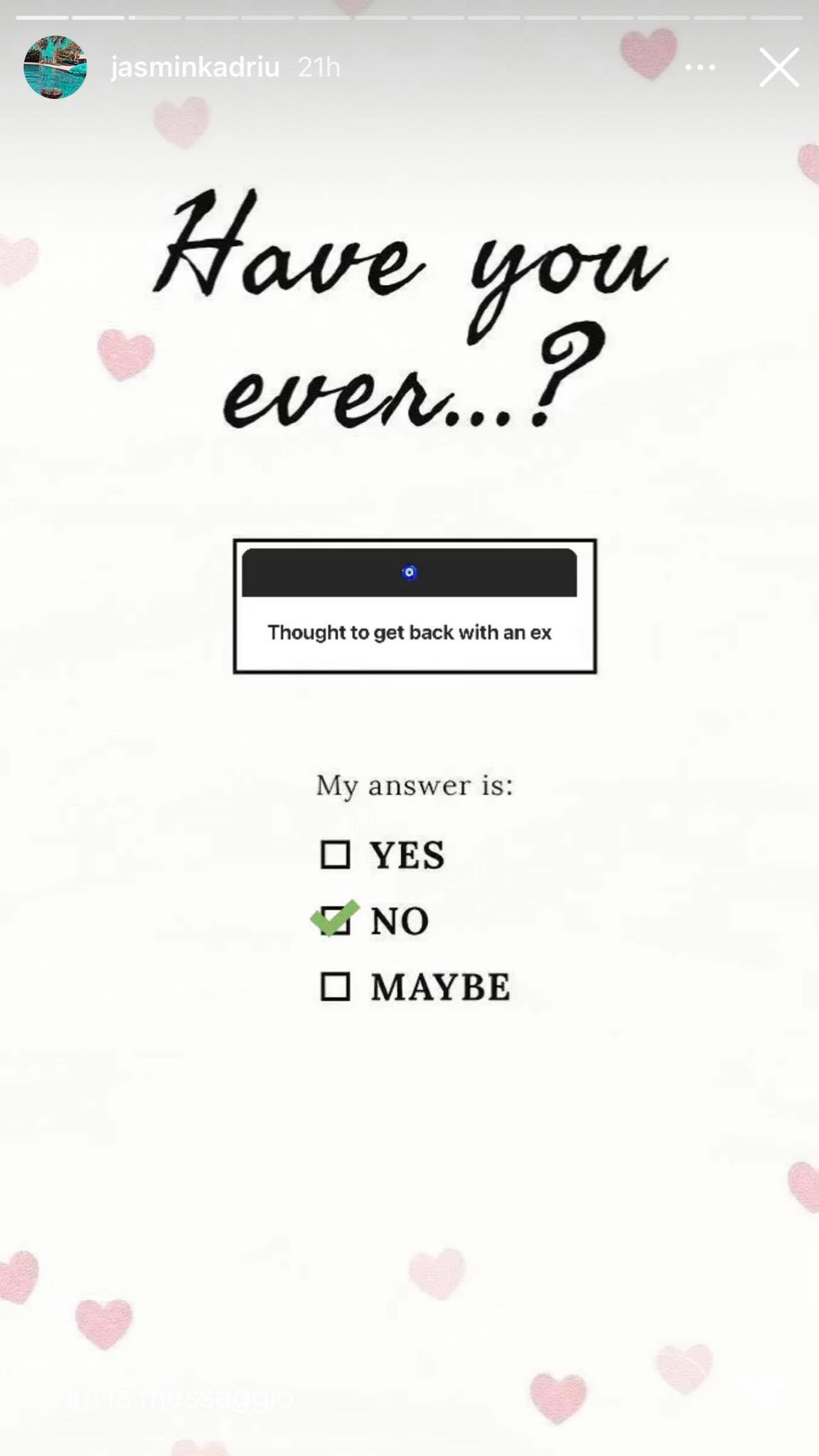 Përmes këtyre pyetjeve, Jasmina ka treguar se nuk ka tradhtuar asnjëherë dhe se nuk është ndarë nga i dashuri. Madje ka zbuluar se nuk lidhet me një djalë që është i lidhur me dikë tjetër.